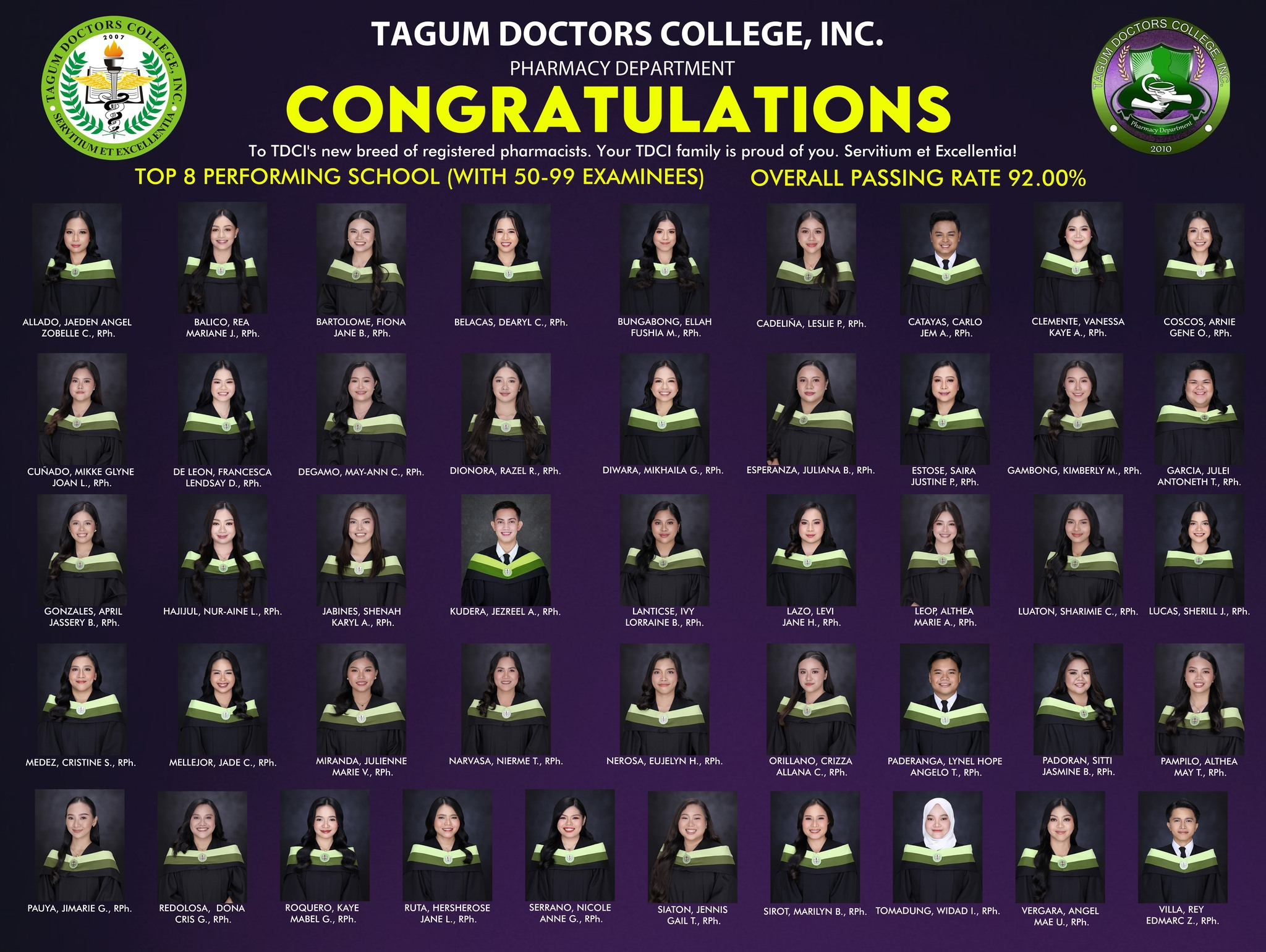 The success of these new pharmacists also reinforces TDCI’s standing as a CHED-recognized higher education institution, committed to academic excellence and professional competence. Guided by national standards set by the Commission on Higher Education, the college continues to cultivate graduates who are not only technically skilled but also ethical and service-oriented. As these 46 passers begin their professional journeys, TDCI extends its congratulations and looks forward to their meaningful contributions to healthcare and public service.